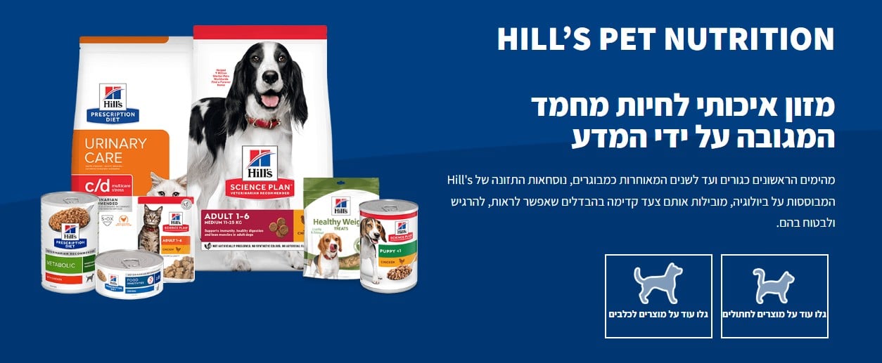 מותג המזון Hill’s הוא מהמובילים בעולם בתזונה קלינית ויומיומית לחיות מחמד. החברה, שפועלת כבר מעל ל-75 שנה, משלבת ידע וטרינרי, מחקרים קליניים מתקדמים, ורכיבים איכותיים ליצירת מזונות מדויקים לכל שלב חיים, בעיה רפואית או צורך תזונתי.