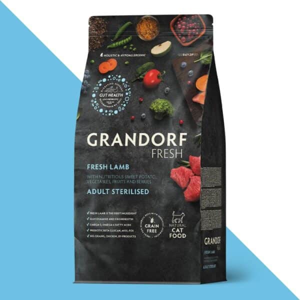 מזון יבש ואיכותי מבית Grandorf, המבוסס על בשר ברווז טרי ואידיאלי לחתולים בוגרים מכל הגזעים.