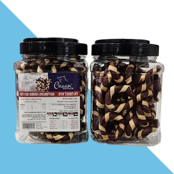 חטיפי טבעות ברווז ודג קוד מבית כנען בצנצנת של 400 גרם, מספקים פינוק בריא וטעים לכלבך. חטיפים אלה עשויים משילוב של בשר ברווז ודג קוד, מהווים מקור חלבון עשיר, ומושלמים לשימוש כפרסים במהלך אימון או פינוק יומיומי.