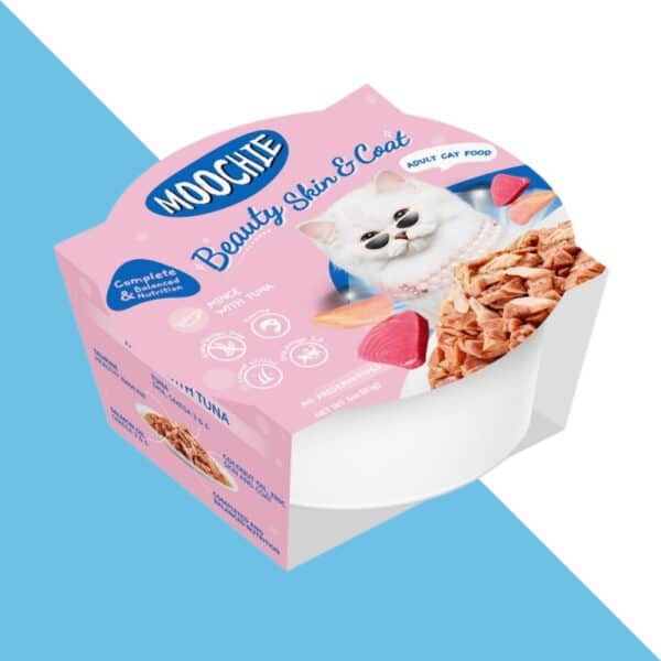 נתחי טונה יעודי לטיפוח הפרווה והעור מאת Moochie הוא מזון רטוב איכותי המכיל רכיבים טבעיים.