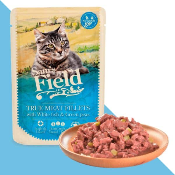 מזון רטוב מבית Sam's Field, המשלב בשר דג לבן ואפונה ירוקה, המעניק תזונה מאוזנת ועשירה. הנוסחה מכילה חלבון מעולה וסיבים תזונתיים המסייעים לעיכול בריא ותומכים במערכת החיסונית של החתול.