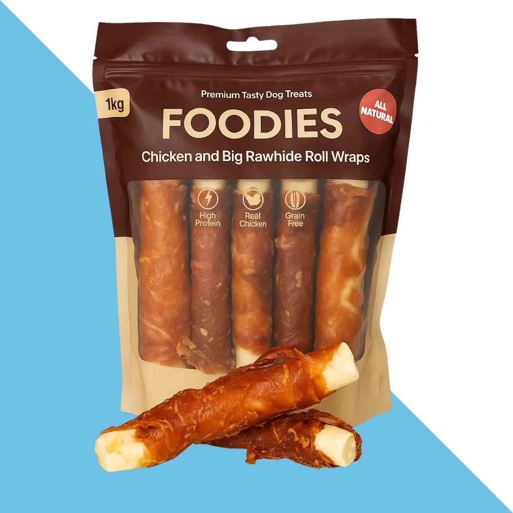 FOODIES מביאים לכם חטיף לעיסה עשיר ואיכותי לכלבים: עצמות עור בקר מגולגלות, מצופות בשר עוף אמיתי, עשירות בחלבון וללא דגנים. חטיף טבעי 100%, מושלם לחיזוק השיניים ולהנאה ממושכת.