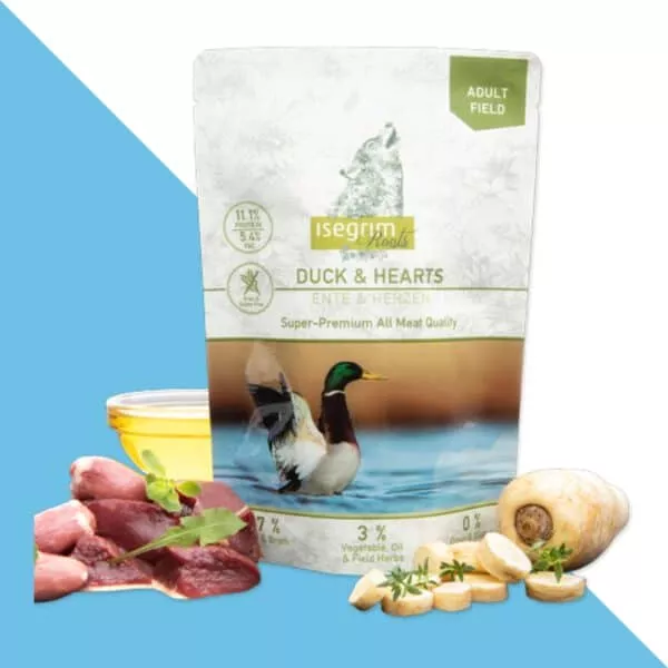 איסגרים ברווז לבבות עוף ושמן פשתן הוא מזון רטוב איכותי לכלבים, המכיל 100% רכיבים טבעיים בלבד. המזון עשיר במינרלים וויטמינים חיוניים, ומספק לכלבכם תזונה הוליסטית מלאה ומאוזנת.