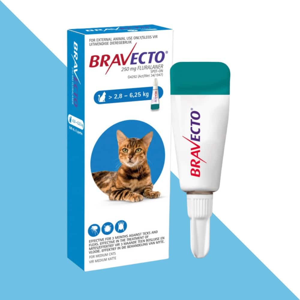 Bravecto Spot-On לחתולים במשקל 2.8–6.25 ק"ג מציע פתרון יעיל, בטוח ונוח להדברת פרעושים, קרציות ואקריות עור למשך של עד 12 שבועות – בטיפול בודד אחד בלבד. האמפולה ניתנת בשימוש חיצוני ונוחה במיוחד לטפטוף על עור החתול, ללא צורך בכדורים או בליעה.