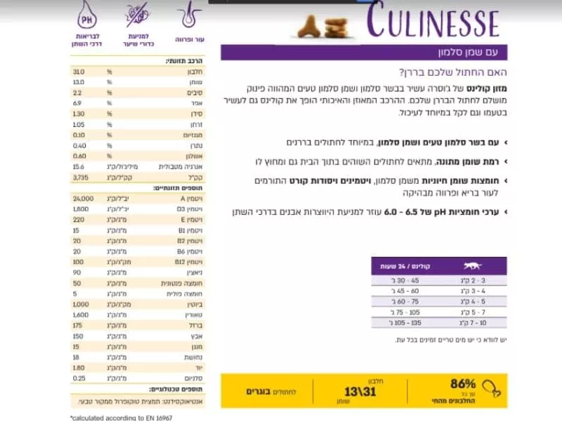 מתאים לחתולים השוהים בתוך הבית גם ומחוץ לו חומצות שומן חיוניות משמן סלמון, ויטמינים ויסודות קורט התורמים לעור בריא ופרווה מבהיקה