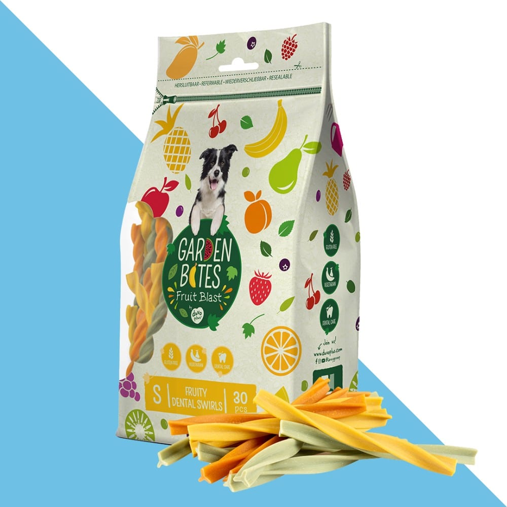 Garden Bites Fruity Dental Swirls הם חטיפים דנטליים טעימים ומזינים לכלבים, המסייעים בשמירה על בריאות השיניים והחניכיים. החטיפים מיוצרים מחומרים טבעיים בלבד, ומכילים פירות עשירות בוויטמינים ונוגדי חמצון. העיצוב המסולסל של החטיף מסייע בניקוי השיניים ומסיר פלאק ואבנית במהלך הלעיסה.
