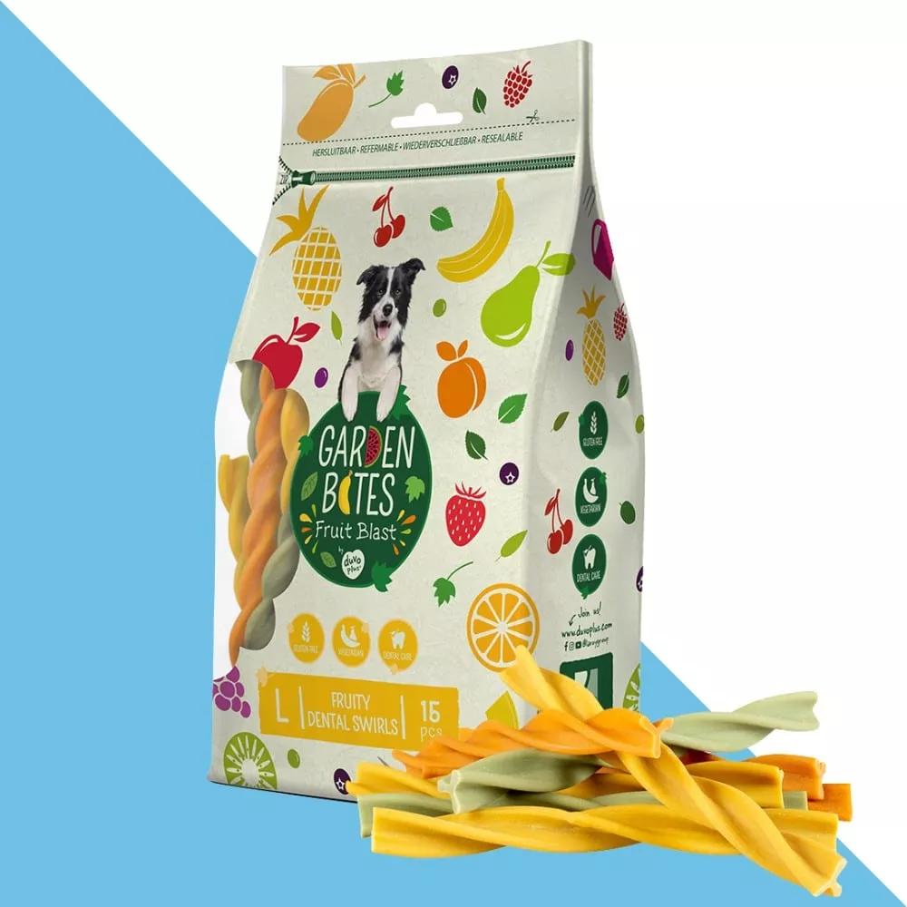 Garden Bites Fruity Dental Swirls הם חטיפים דנטליים טעימים ומזינים לכלבים, המסייעים בשמירה על בריאות השיניים והחניכיים. החטיפים מיוצרים מחומרים טבעיים בלבד, ומכילים פירות עשירות בוויטמינים ונוגדי חמצון. העיצוב המסולסל של החטיף מסייע בניקוי השיניים ומסיר פלאק ואבנית במהלך הלעיסה.