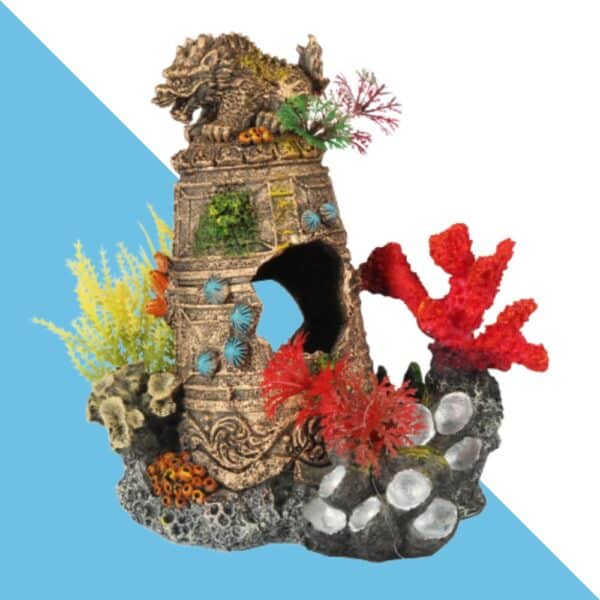 להפוך את האקווריום לאתר ארכיאולוגי תת-ימי! דקורציה מרשימה המעוצבת כשריד של מבנה עתיק או כד חרס גדול שנשכח במצולות. בראש המבנה ניצב פסל של “אריה שומר” (Guardian Lion) או יצור מיתולוגי, המעניק לדגם מראה מלכותי ומסתורי.