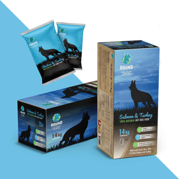 האונד מזון טבעי לכלבים המכיל כ-80% בשר, ובזכות תהליך הבישול היחודי אינו מצריך קירור או הקפאה.