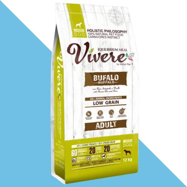 מזון יבש הוליסטי מלא לכלבים בוגרים מגזע בינוני, מבוסס על חלבון איכותי מבשר באפלו טרי. פותח באיטליה תוך הקפדה על איכות ייצור אירופאית גבוהה, ומותאם במיוחד לכלבים עם רגישות לחלבונים מרובים או לדגנים.