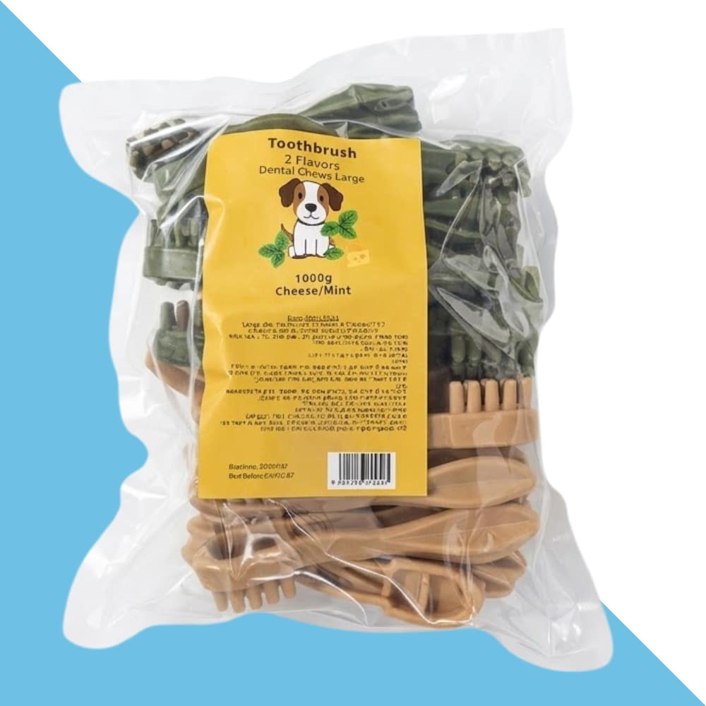 חטיף דנטלי לכלבים בצורת מברשת שיניים – מארז חיסכון 1 ק”ג (מידה L) בטעמי גבינה ומנטה
