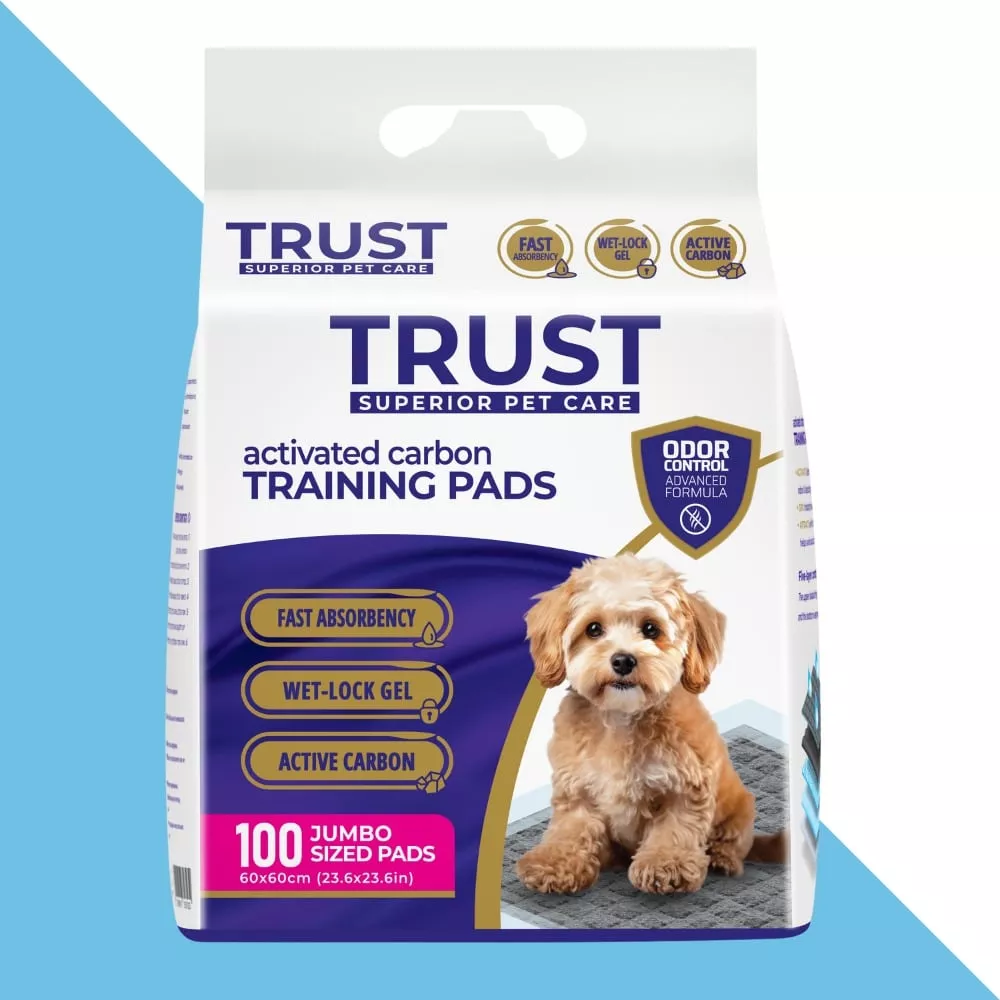 פדים לאימון כלבים עם קרבון של חברת Trust הם הפתרון האידיאלי לאילוף כלבים לעשיית צרכים בבית. כל מארז מכיל 100 פדים בגודל 60×60 ס"מ, המספקים ספיגה מקסימלית ונטרול ריחות לא נעימים בזכות השכבות המתקדמות שלהם.
