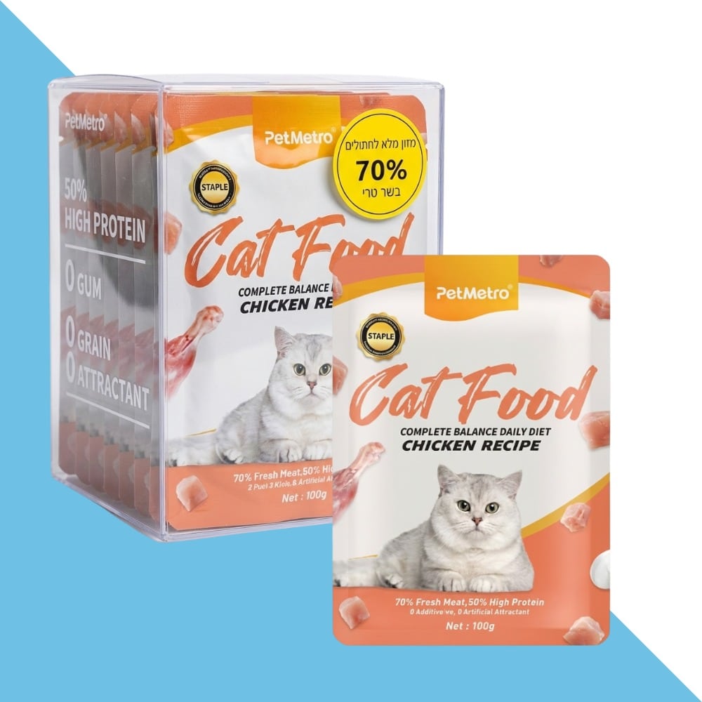מארז 8 יח' פאוץ מזון מלא לחתול – עוף 100 גרם ליחידה pet metro