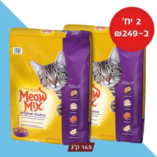 מיאו מיקס 7.2 ק”ג הוא מזון יבש מלא ומאוזן לחתולים, המשלב טעמי עוף, הודו, סלמון ודגי ים.