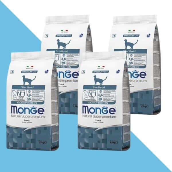 4 שקי Monge Sterilised Trout – מזון לפורל לחתולים מסורסים ורגישים | 1.5 ק”ג כל שק (סה”כ 6 ק”ג)