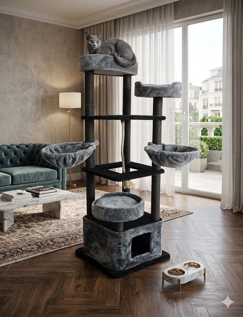 יציבות ועמידות גבוהה: בזכות בסיס רחב (60×60 ס”מ) וחלוקת משקל חכמה, המתקן יציב מאוד ובטוח לחלוטין גם לחתולים גדולים, כבדים, או כאלה שאוהבים לזנק ולקפוץ באנרגיות גבוהות.