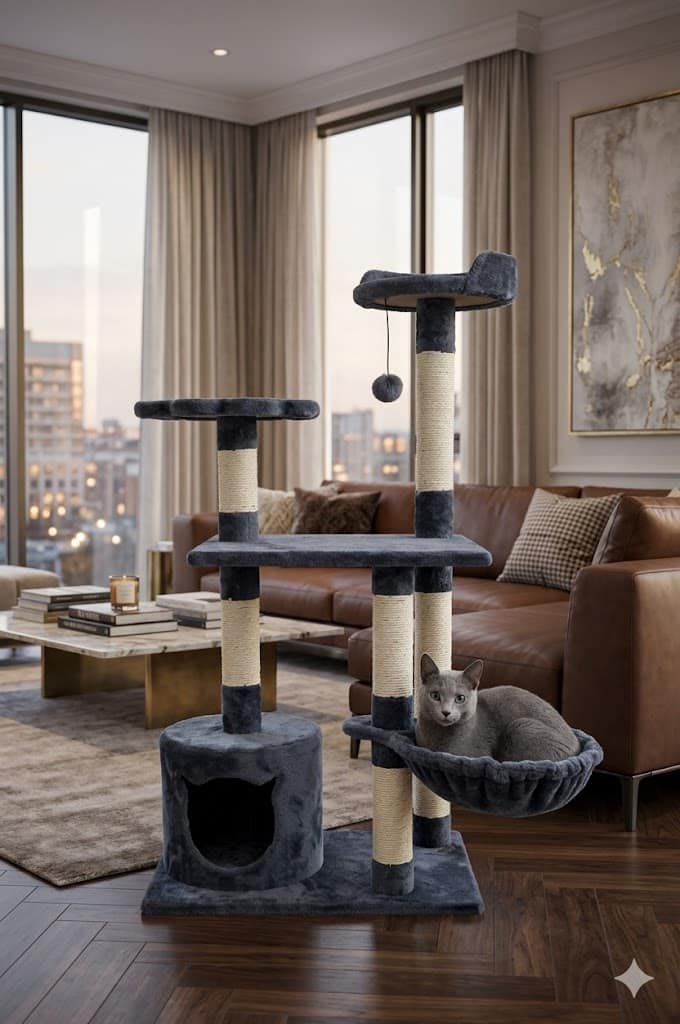 • יציבות ובטיחות: בזכות הגובה הבינוני והבסיס הרחב, המתקן יציב מאוד ובטוח לטיפוס ולקפיצות גם עבור חתולים נמרצים.