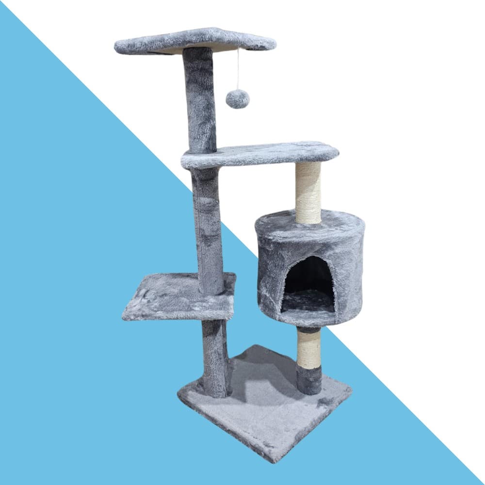 מתקן גירוד אפור עם בית עגול בגובה 105 ס"מ הוא פינת משחק ורגיעה מושלמת לחתולים. המתקן כולל בית מחסה עגול ונעים לשינה, משטחים רחבים לטיפוס ולשכיבה, כדור תלוי למשחקים אינטראקטיביים ועמודי גירוד עטופים בחבל סיסל עמיד.