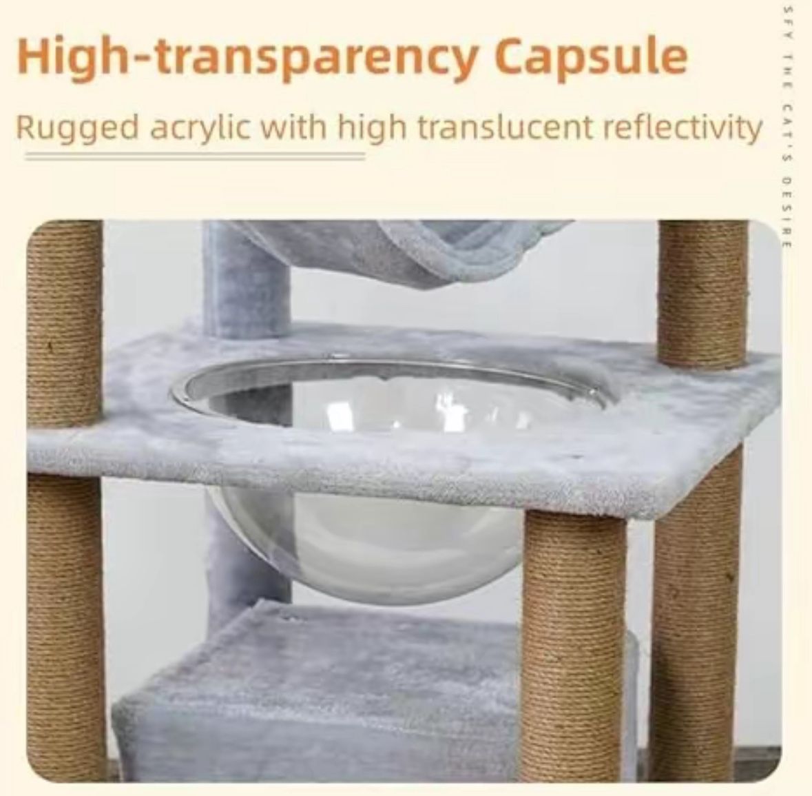 מתקן גירוד איכותי ומודרני בגוון אפור בהיר, המשלב עיצוב אלגנטי עם פונקציונליות מושלמת לחתולים. המתקן כולל בית קפסולה שקוף, ערסל רך ונעים, ועמודי גירוד עבים מלופפים בחבל סיסל טבעי – כל מה שחתול צריך למשחק, שינה וטיפוס.