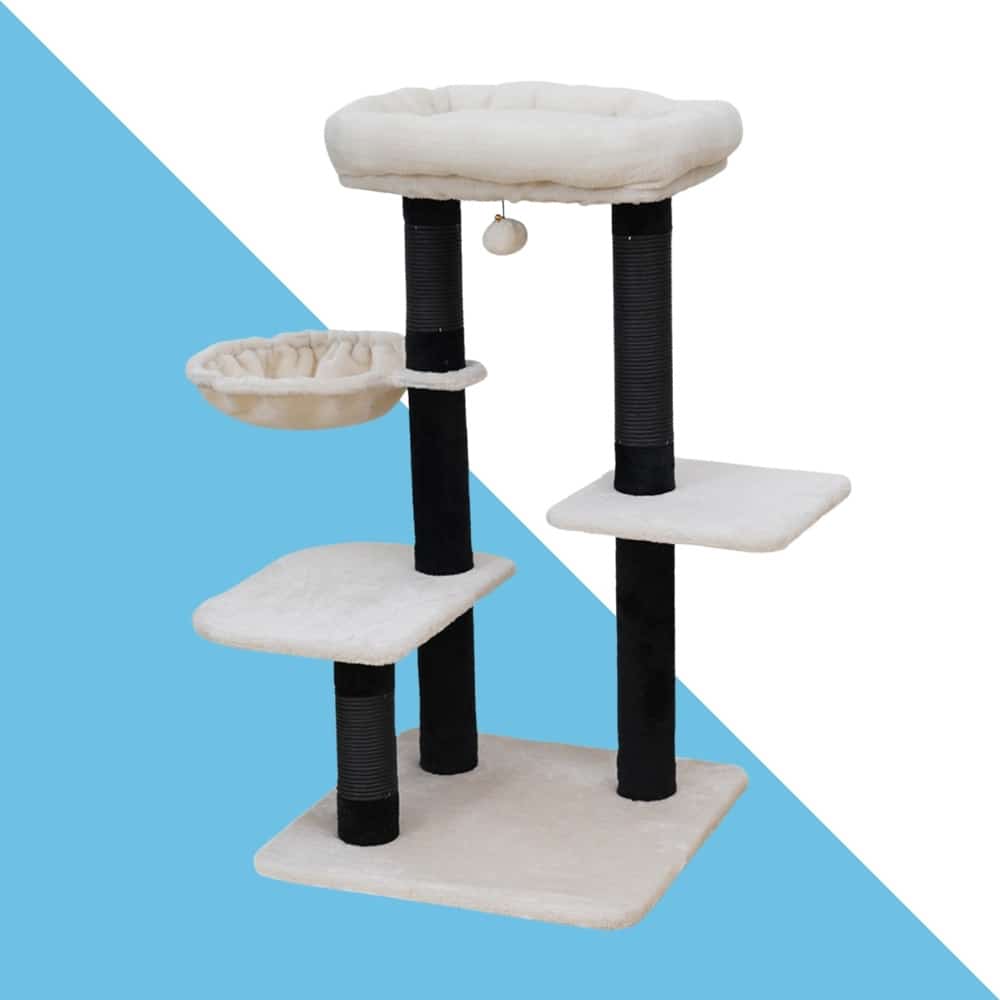 המתקן, המתנשא לגובה של 95 ס"מ, משלב בין צבעי קרם רכים לבין עמודים שחורים דרמטיים, מה שמעניק לו מראה יוקרתי ומודרני. הוא כולל שני משטחי דריכה מדורגים לטיפוס קל, ערסל עמוק ("Basket") שחתולים פשוט מכורים אליו לשנת צהריים, ומיטה עליונה עם דפנות מוגבהות לתצפית על הבית.