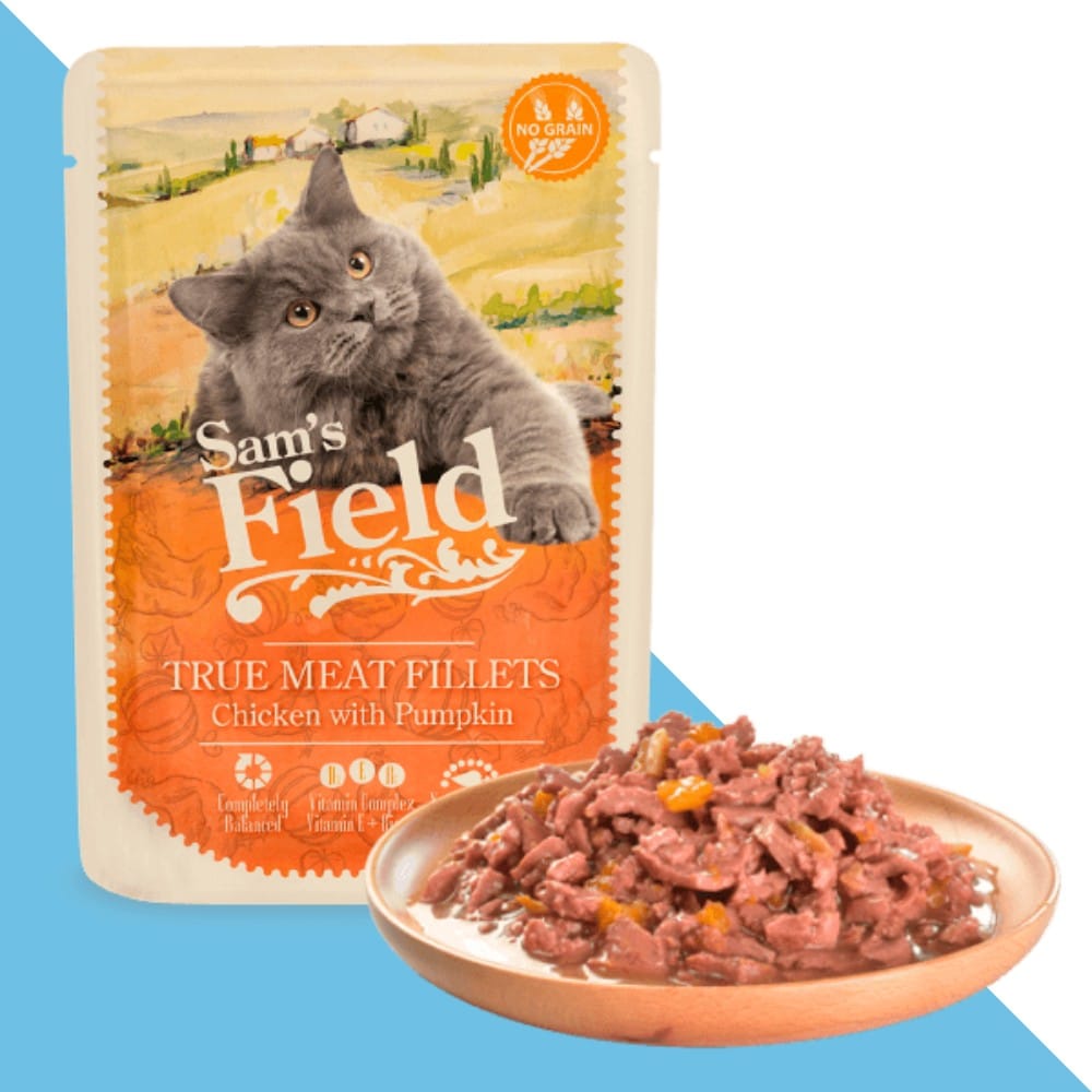 מזון רטוב מבית Sam's Field, המשלב בשר עוף עם דלעת, המעניק תזונה מאוזנת ועשירה. הנוסחה מכילה חלבון מעולה וסיבים תזונתיים המסייעים לעיכול בריא ותומכים במערכת החיסונית של החתול.