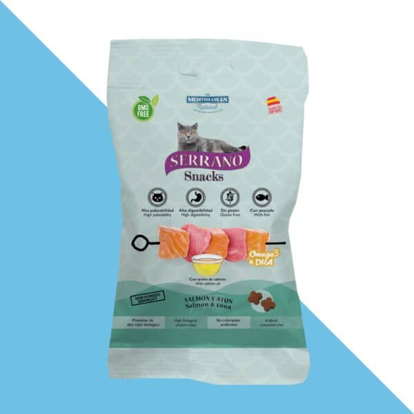 חטיפי Mediterranean Natural Serrano לחתולים מועשרים בחומצות שומן אומגה 3 ואומגה 6, אשר חשובות לשמירה על בריאות העור והפרווה, תמיכה במערכת החיסונית ובבריאות הלב והכליות. התוספת של חומצות השומן הללו מסייעת לוודא שהחתול שלך מקבל תזונה מאוזנת שתומכת בבריאותו הכוללת.