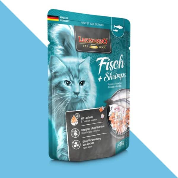 LEONARDO® Fish & Shrimps הוא מזון לחתולים המכיל דגים ושרימפס. המזון עשיר בחלבונים, חומצות שומן אומגה 3, ושמן סלמון, שתורמים לבריאות העור והפרווה ולתחושת חיוניות כללית.