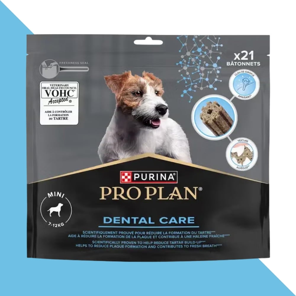 Pro Plan Dental Care הוא חטיף דנטלי המיועד במיוחד לכלבים קטנים, עם פורמולה מתקדמת המסייעת בניקוי יסודי של השיניים ובהפחתת פלאק ואבנית. החטיף בעל מרקם ייחודי המעסיק את הכלב בלעיסה ממושכת, תורם לשחיקת הפלאק, ושומר על היגיינת פה אופטימלית ונשימה רעננה.