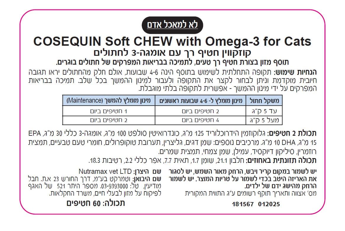 הפתרון המתקדם והטעים לשמירה על בריאות המפרקים של החתול שלך! חטיפי ה-Soft Chews של המותג המוביל Nutramax הם הדרך הקלה והנוחה ביותר לתמוך בניידות ובאיכות החיים של חתולים. בניגוד לכדורים שקשה לתת, תוסף ה-Cosequin מגיע כחטיף רך וטעים שהחתול ישמח לאכול.