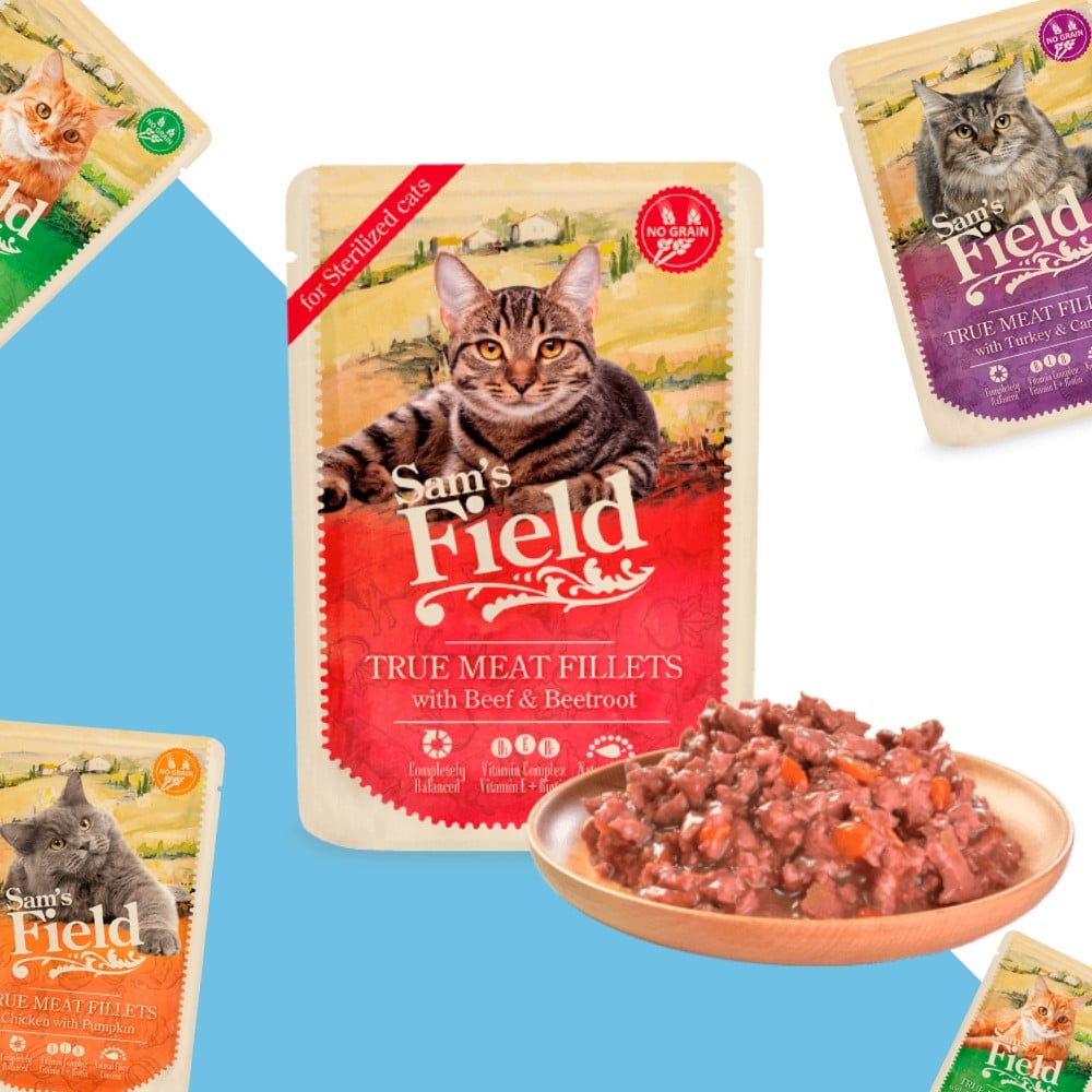 מזון רטוב מבית Sam's Field, המשלב מגוון סוגי בשר ודג עם ירקות, מזון המעניק תזונה מאוזנת ועשירה. הנוסחה מכילה חלבון מעולה וסיבים תזונתיים המסייעים לעיכול בריא ותומכים במערכת החיסונית של החתול.