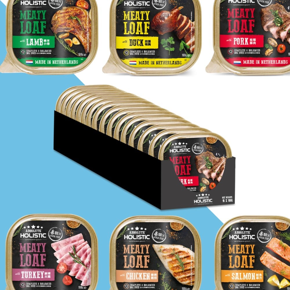 המארז כולל 16 שימורים במשקל 100 גרם כל אחד, מסדרת Absolute Holistic – מזון רטוב פרימיום עם רכיבים איכותיים בלבד, ללא דגנים, במרקם פטה רך ונימוח שהכלבים פשוט אוהבים.