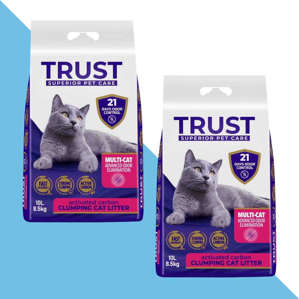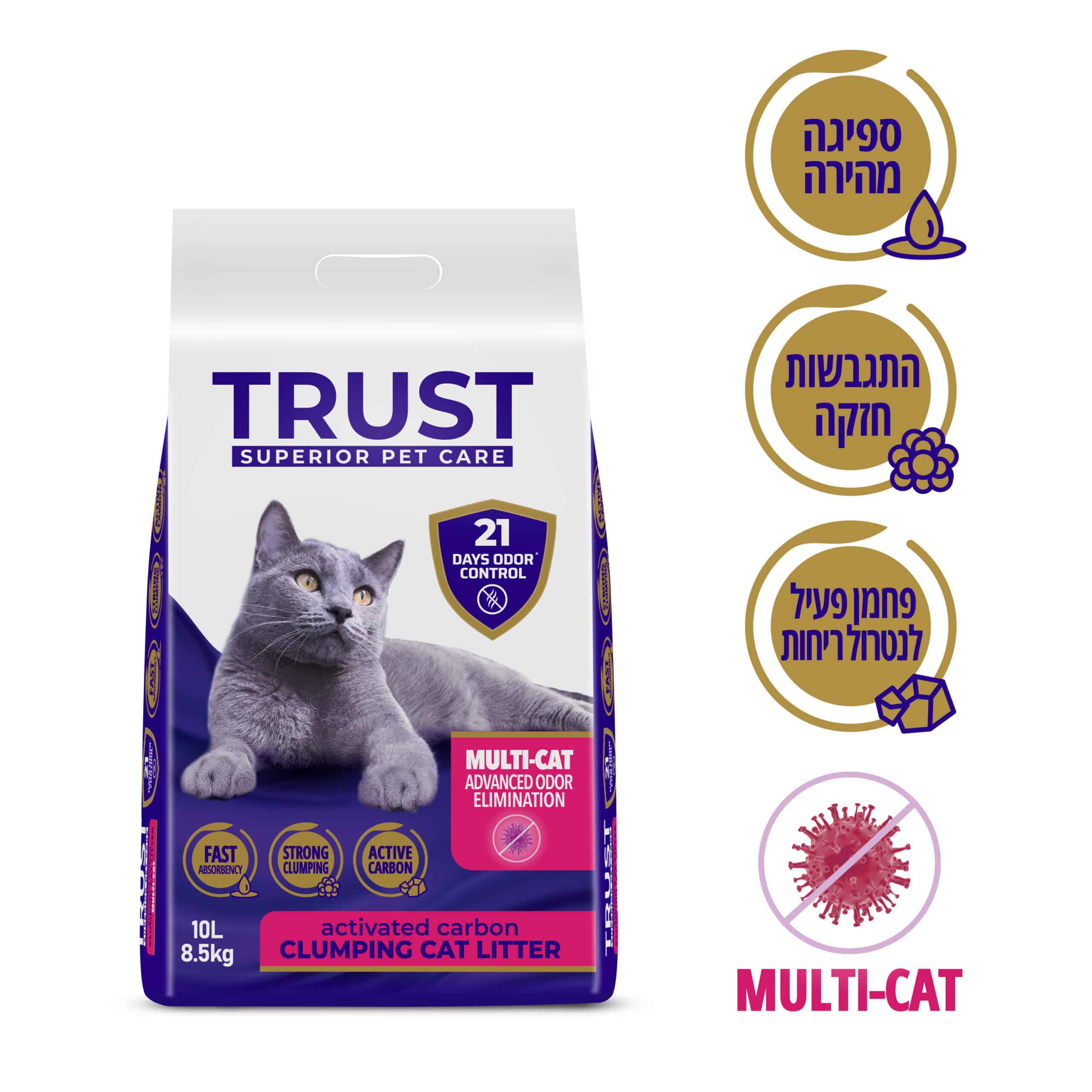 חול מתגבש איכותי במיוחד מבית TRUST, המשלב פחם פעיל לספיגה מוגברת של ריחות ונטרול חיידקים. אידיאלי לבית עם מספר חתולים בזכות יכולת ספיגת הריחות יוצאת הדופן, ההתמצקות החזקה והניקיון הקל במיוחד.