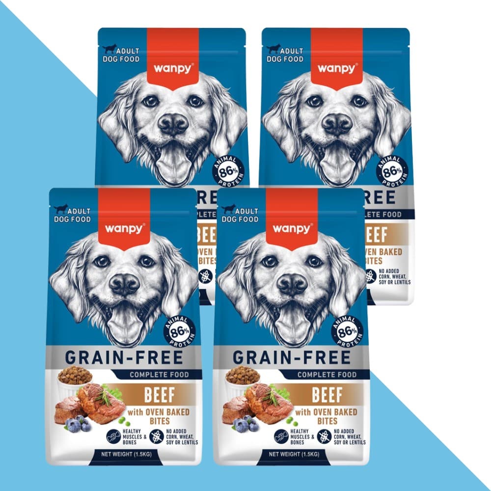 4 שקי וונפי בקר 1.5 ק"ג לכלב בוגר מכל גזע ללא דגנים | 6 ק"ג Wanpy