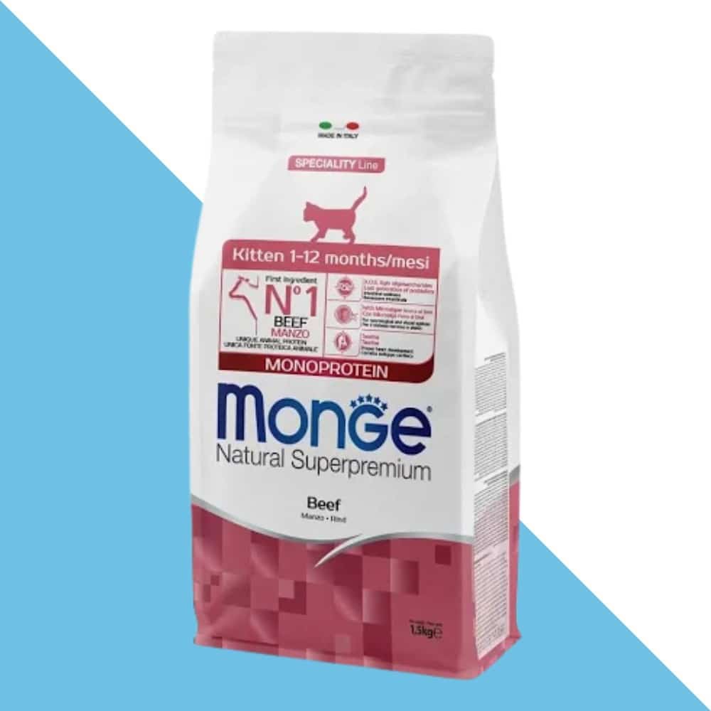 Monge Natural Superpremium Kitten Beef הוא מזון יבש איכותי לגורי חתולים מגיל 1 עד 12 חודשים – עם חלבון יחיד ממקור בקר, לפיתוח בריא של מערכת השרירים, מערכת העיכול והמערכת החיסונית.